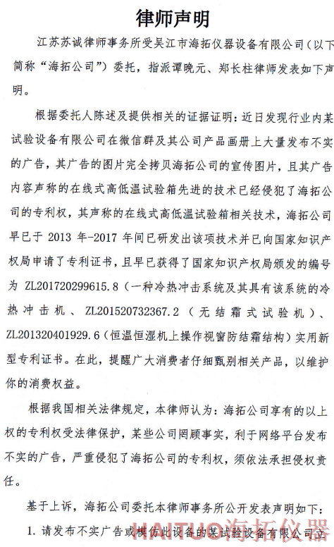 海拓儀器律師聲明:反對侵權(quán)行為 維護(hù)公司和消費者權(quán)益摘要:國內(nèi)試驗設(shè)備領(lǐng)先者吳江市海拓儀器設(shè)備有限公司委托律師事務(wù)所發(fā)布了律師聲明,該聲明指出,當(dāng)前市面上出現(xiàn)了產(chǎn)品專利侵犯海拓儀器權(quán)益,海拓儀器將以法律手段維護(hù)自身利益。該律師聲明要求某試驗設(shè)備有限公司立即停止侵權(quán)行為,扯下其在網(wǎng)絡(luò)平臺的相關(guān)廣告和宣傳畫冊并同時停止生產(chǎn)同款設(shè)備。如果該設(shè)備公司不聽勸解,海拓儀器將向人民法院依法起訴該公司侵權(quán)行為,以維護(hù)自身合法權(quán)益和維護(hù)客戶消費權(quán)益,并建議廣大消費者仔細(xì)甄別相關(guān)產(chǎn)品。? ? ? ?近日,吳江市海拓儀器設(shè)備有限公司委托律師事務(wù)所發(fā)布了律師聲明,該聲明指出,當(dāng)前市面上出現(xiàn)了產(chǎn)品專利侵犯海拓儀器權(quán)益,海拓儀器將以法律手段維護(hù)自身利益。??事件源起于海拓儀器發(fā)現(xiàn)市面上有同類設(shè)備公司通過完全拷貝海拓儀器產(chǎn)品宣傳圖片,在微信群及該公司產(chǎn)品畫冊上大量發(fā)布不實廣告。??聲明指出,該廣告聲稱的在線式高低溫試驗箱的技術(shù)侵犯了海拓儀器的專利權(quán),該產(chǎn)品專利由海拓儀器 -